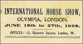 *International Horse Show, Olympia, London. June 18th to 27th, 1908 / R. Clover (?) - London : Olympia International Horse Show, 1908. - 1 cartolina postale : cromolitografia ; 87x140 mm. ((Titolo, edizione e data indicazione a stampa sul verso seguita dall'indirizzo: "Offices: 12, Hannover Square, London W. Autore da firma facsimilare in calce all'immagine sul recto. - Sul recto, in calce a sinistra, a stampa la dicitura "Copyright".