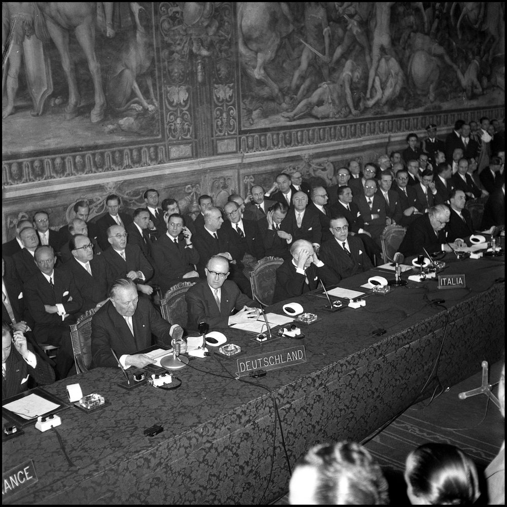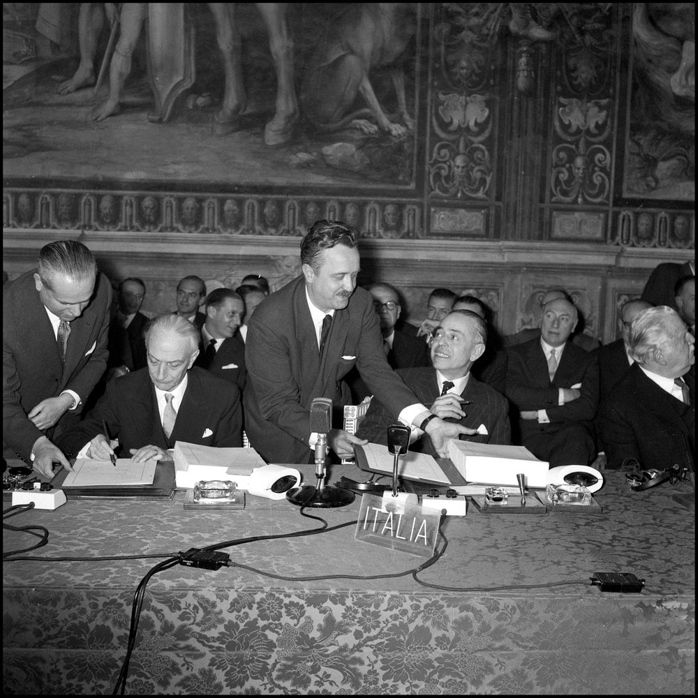 Il 25 marzo 1957, a Roma, nel corso di una solenne cerimonia in Campidoglio, nella sala degli Orazi e Curiazi, furono sottoscritti due atti fondamentali nel processo d’integrazione europea: il Trattato sulla Comunità economica europea (CEE) e il Trattato sulla Comunità europea dell’energia atomica (Euratom).