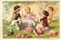 *Pernot-Gille - Dijon : A la ville comme a la campagne, on est heureux de trouver partout les dédicieux Biscuits de la maison Pernot-Gille/ Lith. Vieillemard & ses Fils, Paris. - Paris : Lith. Vieillemard et ses Fils, [1886-1895]. - 1 figurine :cromolitografia ; 68X103 mm. - Per le date cfr. WELD P4 BV3-40. Al verso è riportato lo spartito di una canzone.