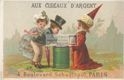 Aux *Ciseaux d' Argent 4, Boulevard Sébastopol, Paris / Lith: Alfred Clarey, à Asnières, (Seine). - Asnières (Seine) : Lith. Alfred Clarey, [1877-1884]. - 1 figurina : cromolitografia ; 74x112 mm. - Nome dell' A. al verso. Prima data da calendario al verso della fig. n. inv. 7865. Per la seconda data cfr. WELD P11 CL3-6. Al verso si trova una grossa abrasione.