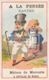 | Descrizione | A la *Pensée Nantes Maison de Mercerie & Articles de Modes / [Dangivillé & Cie.]. - Paris : Lith. de Casabianca et Ce., boulev. Voltaire, [1878-1880]. - 1 figurina : cromolitografia ; 71x48 mm. - Nome dell' A. da altre figurine appartenenti alla stessa serie iconografica. Date da comunicazione scritta della Sig.ina Lucilla de Magistris. Segno di piegatura al centro orizzontalmente. | |