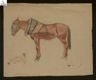 [*Cavallo bardato per il traino / Renato Brozzi]. - [1907-1915]. - 1 disegno : sanguigna, carboncino e sfumino con lievi lumeggiature a biacca ; 435x530 mm. - Tit., A. e data di esec. del cat. In bs. a ds., schizzo di chioccia con pulcini a pastello nei colori rosso carminio, terra di Siena naturale, giallo ocra, nero. In bs. a ds., abbozzo di anatra a carboncino. Carta da pacco beige tagliata irregolarmente lungo il margine laterale ds. (( Carta [1] recto.
